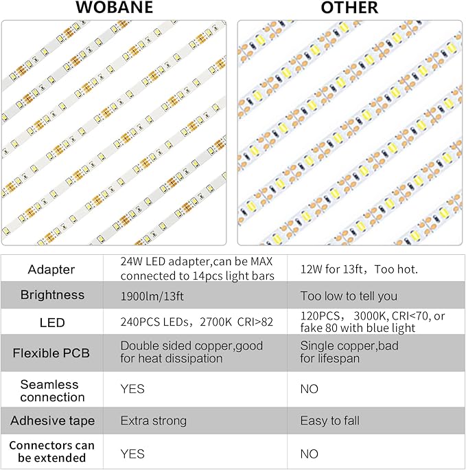 • Extra 2 x 20inch + 4 x 6.7inch straight connectors,It is good for connecting long-distance cabinets,like passing through microwaves, windows,and so on.24W adapter can be Max connected to a total of 14PCS (22.96ft )WOBANE LED light bar