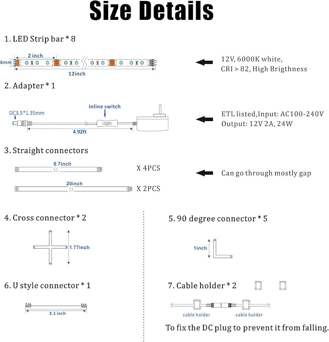 • DIY Light Kit:Total 8 pcs pre-cut LED strip bars and a large number of connecting accessories,suitable for DIY special topic,or interesting graphics(such as led cross),or lighting in various occasions