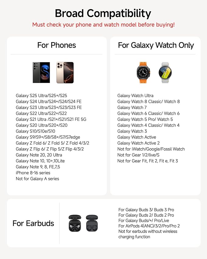 • Wide Compatibility - The watch charging area is specifically designed for Samsung Galaxy Watch Ultra/8/8 Classic/7/6/6 Classic/5/5 Pro/4/4 Classic/3/Active 1/2. The phone and earbud charging areas support all wireless charging phones and earbuds, compatible with S25 Ultra/S25+/S25/S24 Ultra/S24+/S24/S23/S22/S10/Note 20/Z Flip7/Z Fold6 and iPhone 16 series, as well as Galaxy Buds series. (Note: Not for Apple Watch)