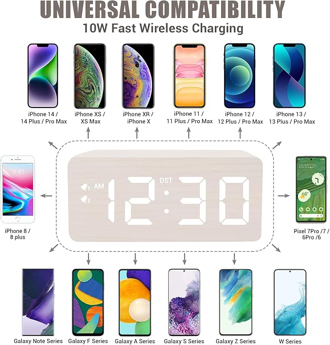 • ⏰【Multifunctional All-in-one Clock】- It combines alarm clock, wireless charger and USB charging port - all in a minimalist wood box, ultra-compact design fits easily on any table, bedroom or bedside for decor.