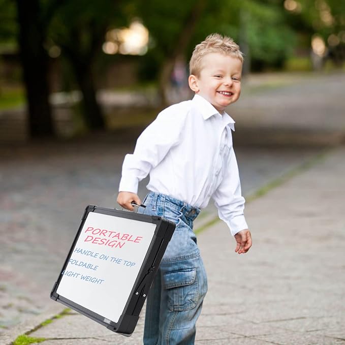 • STURDY AND PORTABLE - Double sided stand up small tabletop magnet dry erase whiteboard easel with solidly built but light weight. It is portable with a handle on the top for travelling.