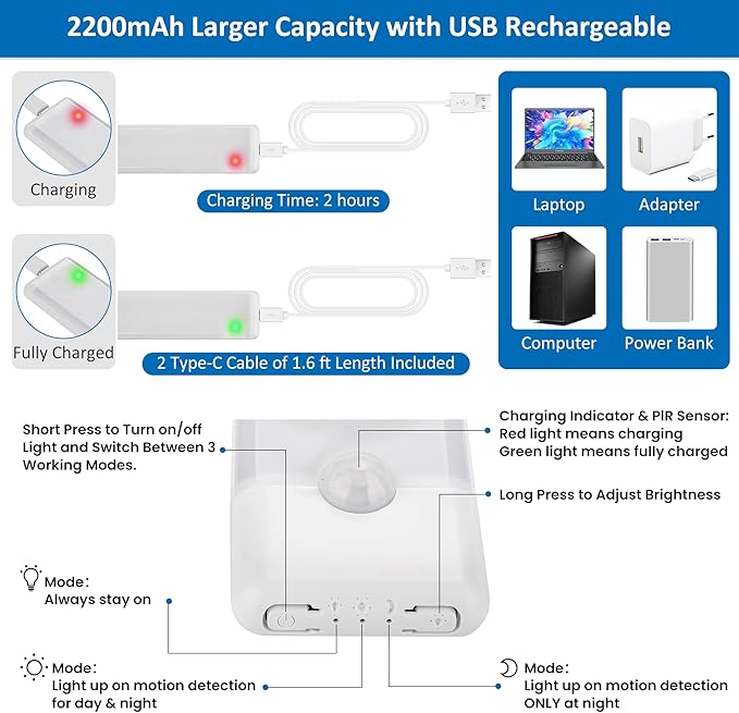 • USB Rechargeable: Equipped with a built-in 2200 mAh high-capacity rechargeable battery and a USB-C port, these rechargeable under cabinet lighting can be fully charged in just 2 hours. After fully charged, they provide 3-5 hours of continuous usage in ON mode and up to 6 weeks in motion sensor mode (based on 10 uses per day). Charge occasionally but benefit daily