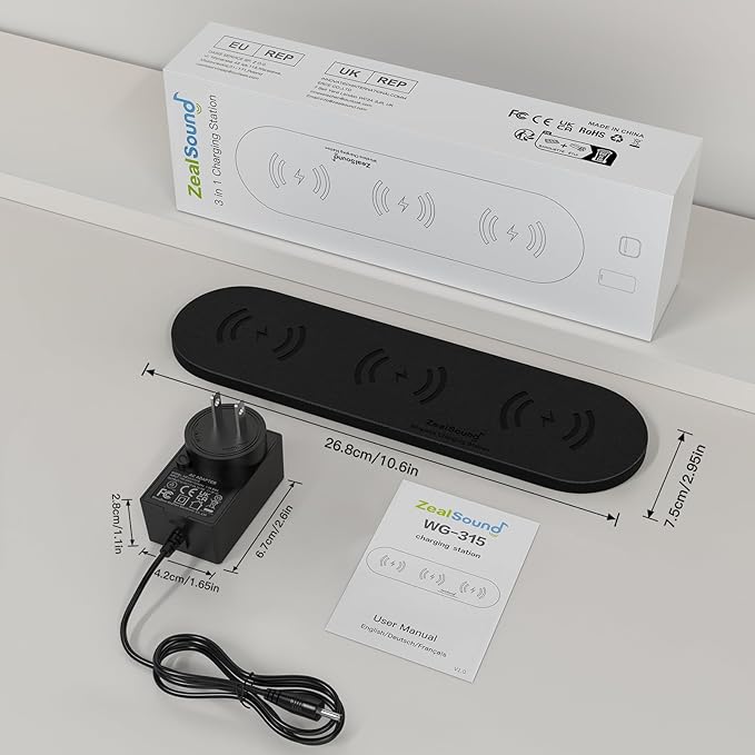 - Fast & Intelligent Charging — The triple wireless charging pad powered by a 36W adapter, the first device charges at up to 15W, bringing a typical smartphone to about 50% in roughly 30 minutes, while the second and third devices automatically adjust to 10W. The charger intelligently identifies each device's needs, delivering safe, efficient power without stressing phone or earbud batteries. This fast, balanced setup supports real daily demands—professionals topping up in meetings, teachers keeping devices ready through busy class schedules, and students powering essentials during long study sessions. High-speed charging keeps everything ready when you need it.