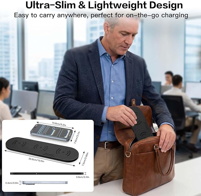 - Ultra-Thin & Portable — This portable charger weighs just 5.6 oz and only 0.35 in thick, this wireless charging pad slips easily into a backpack, purse, or travel pouch. With one cable powering both your phone and earbuds, you can leave extra cords and bulky chargers behind. Its compact, lightweight build is perfect for frequent flyers charging during airport layovers, commuters who need quick top-ups on trains or buses, students moving between classes, and remote workers who rotate between cafés and shared spaces. Whether you're heading out for a weekend trip or navigating a busy day, this slim pad keeps your essentials powered without adding bulk.