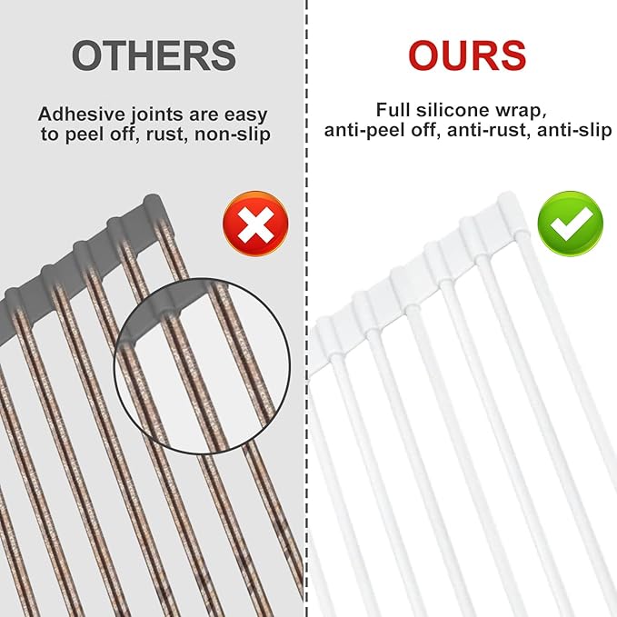 • Upgraded Non-slip & Heat Resistant Full FDA Food Grade Silicone Wrapped Dish Drying Rack: Much sturdier than the stainless steel sink drying rack and will never slide around like a metal one without a coating! The silicone roll up dish drying rack is BPA Free for safe use on fruits, veggies, cake, etc. So the dish racks for kitchen counter can be also used as a trivet to place things that take directly out of the oven! Heat resistant 400°F (204°C) so use it to protect countertops from hot pans.