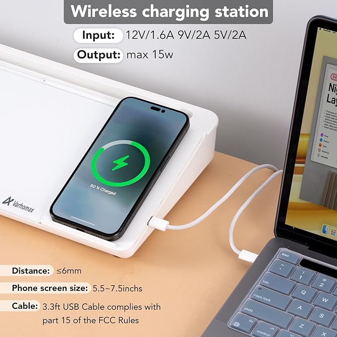 • Wireless Charge Station: This desk glass white board with wireless charger stand makes it very convenient to charge your compatible devices safety without additional cables or adapters. The accessary 3.3ft USB Cable complies with part 15 of the FCC Rules