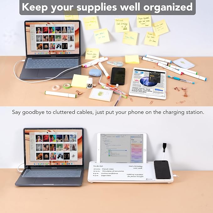 • Multi-functional Design: Sitting compactly between your monitor and keyboard, you can use it as a desk to do list whiteboard, or phone charger, or phone/tablet holder, or keyboard stand. It can used for your office task organization, family schedule and workout plan