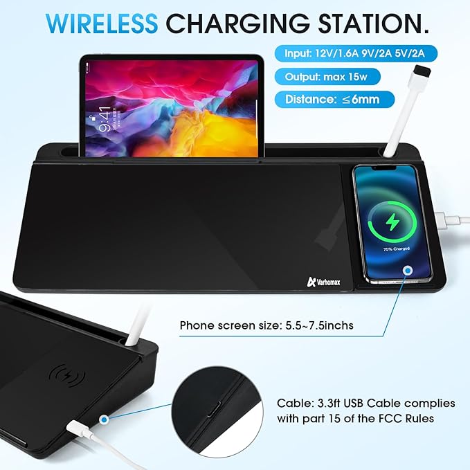 • Wireless Charge Station: This desk glass white board with wireless charger stand makes it very convenient to charge your compatible devices safety without additional cables or adapters. The accessary 3.3ft USB Cable complies with part 15 of the FCC Rules
