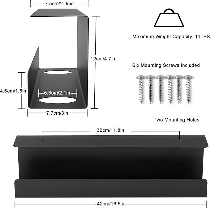• Cable Management Tray Specifications: 16.5in long, 3in wide at the bottom, raised design 4.7in high. Sturdy and durable metal material, 1mm thick, twice the weight capacity of plastic trays (up to 11lb); no need to worry about deformation when heavy items are placed