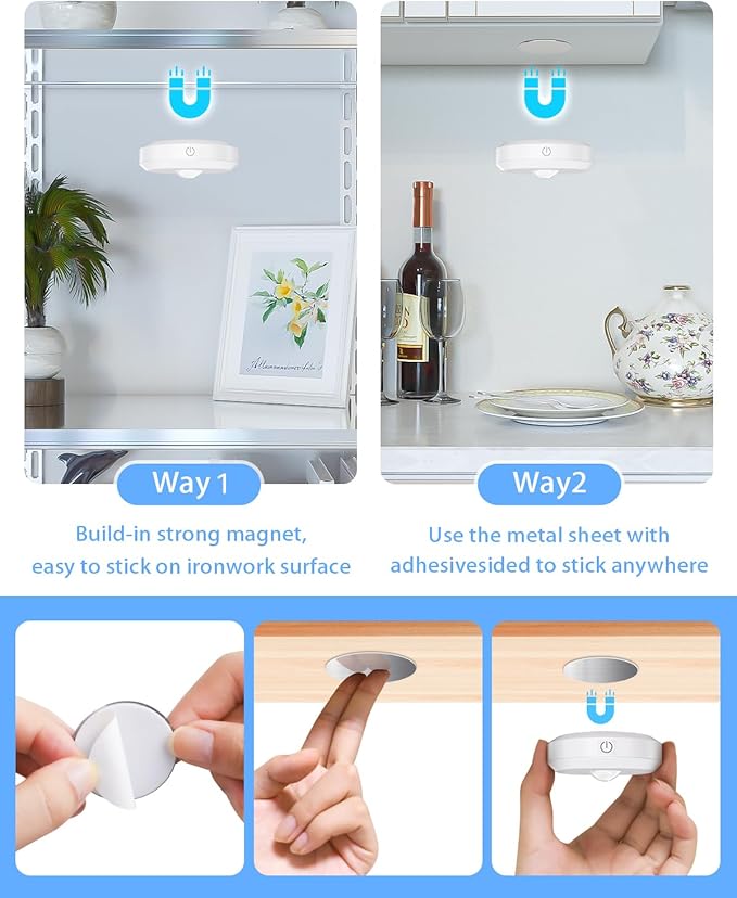 • [Easy to Install & Free Replacement] - The rgb under cabinet lights has a built-in magnet on the back, allowing you to stick it directly to any metal surface or use adhesive tape for non-metal surfaces. These stick on lights is perfect for kitchen cabinets, shelves, display cases, walls, and bedrooms. We offer a 12-month warranty, feel free to contact us if you have any issues.