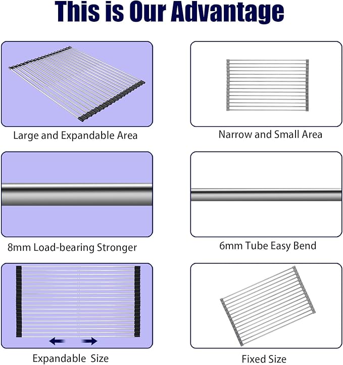 • HIGH QUALITY MATERIALS: The kitchen drying rack is made of premium and enlarged 304 stainless steel, which has more weight-bearing capacity than similar products. The stainless steel tubes are fitted with BPA-free silicone at both ends to ensure that the dish drying rack does not slide on the sink
