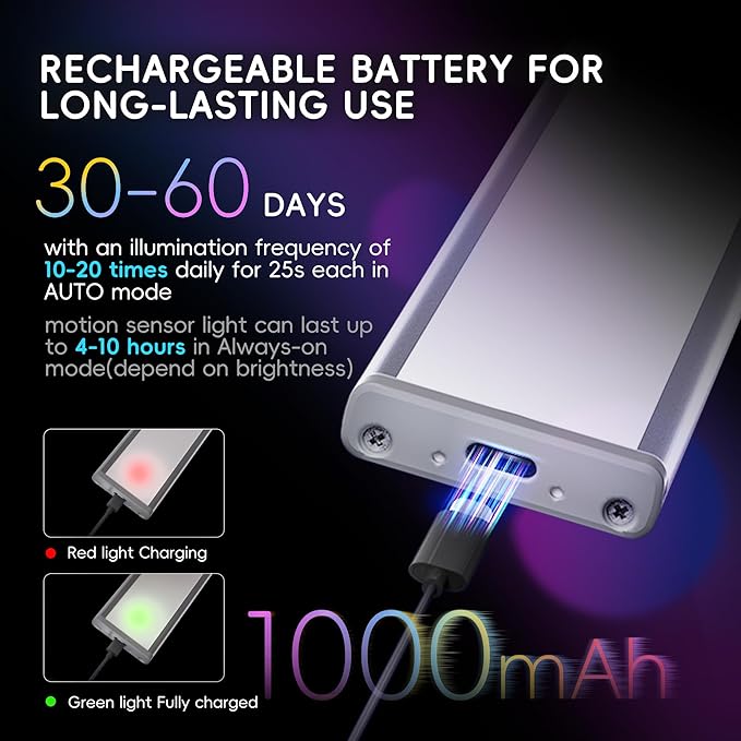 • [1000mAh Rechargeable Battery for Long-Lasting Use] -- Hopedone under counter lights are built-in 1000mAh rechargeable battery, so that the closet lights feature a larger capacity compared to other LED strip lights on the market, resulting in longer actual endurance. When fully charged, our motion sensor light can last up to 4-10 hours in Always-on mode(depend on brightness). 30-60 days with an illumination frequency of 10-20 times daily for 25s each in AUTO mode. Say goodbye to buying dry batteries - save energy, time, and money.