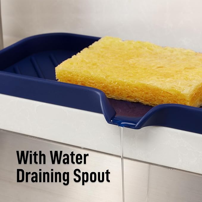 • MESS-FREE KITCHEN: Effortlessly keep your sink and countertops clean and organized with our large silicone sponge holder. Measuring 12 x 4 inches, this spacious tray is perfect for holding multiple cleaning sponges, scrub brushes, dish soap bottles, hand soap bars, silverware, and more. Its versatile size also makes it ideal for use in utility rooms, bathrooms, laundry areas, or on your vanity to store makeup and small accessories.