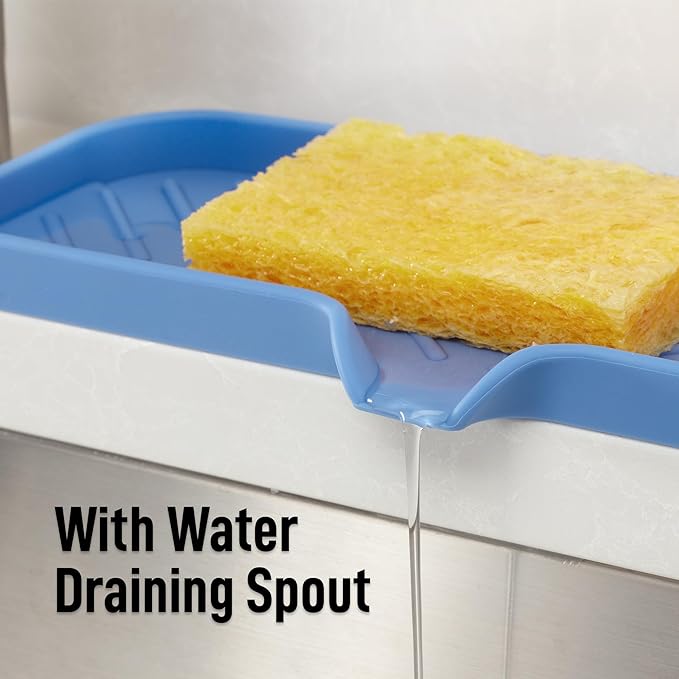 • MESS-FREE KITCHEN: Effortlessly keep your sink and countertops clean and organized with our large silicone sponge holder. Measuring 12 x 4 inches, this spacious tray is perfect for holding multiple cleaning sponges, scrub brushes, dish soap bottles, hand soap bars, silverware, and more. Its versatile size also makes it ideal for use in utility rooms, bathrooms, laundry areas, or on your vanity to store makeup and small accessories.
