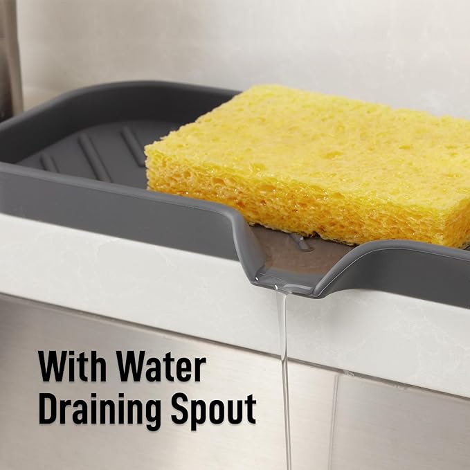 • MESS-FREE KITCHEN: Effortlessly keep your sink and countertops clean and organized with our large silicone sponge holder. Measuring 12 x 4 inches, this spacious tray is perfect for holding multiple cleaning sponges, scrub brushes, dish soap bottles, hand soap bars, silverware, and more. Its versatile size also makes it ideal for use in utility rooms, bathrooms, laundry areas, or on your vanity to store makeup and small accessories.