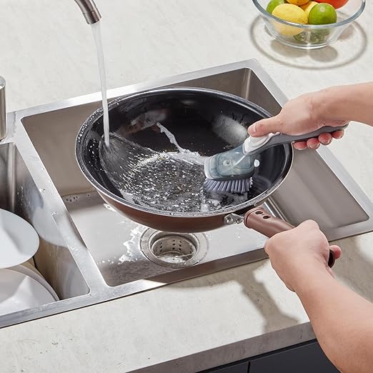 • One-Touch Liquid Dispensing: Featuring a built-in liquid dispenser, the handle stores your cleaning liquid. Simply press to release the liquid while you clean – no need to grab separate dish soap, saving you time and effort