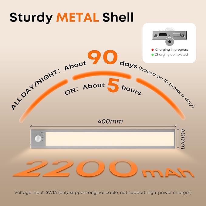 • ★Upgraded Battery & Rechargeable Device: 2200mAh high-capacity battery ensures sufficient brightness and longer usage time. The USB-C port can be easily fully charged in just about 3 hours, which provides sufficient power for about 5 hours in on mood or 3 months in sensor mood (based on 10 activations per day)