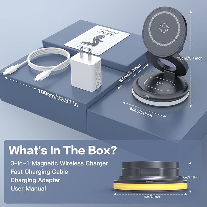 - Special Feature : 15W Fast Charging, Multi Device Charging, Safe, Reliable, and Intelligent Charging, Lightweight Design, Portable and Travel-Friendly, Compatible with iPhone 17, iPhone 16, iPhone 15, iPhone 14, iPhone 13, iPhone 12 series (MagSafe models), iPhone 8–11 series (standard wireless charging), Apple Watch Ultra 2/Ultra/SE/9/8/7/6/5/4/3/2, AirPods Pro 2/Pro/3/2 with wireless charging case, and other smartphones and earbuds which supports wireless charging., 3-in-1 Wireless Charging Station,MagSafe Wireless Charger with Strong Magnetic Alignment, Magnetic, Magsafe Compatible, Fast Wireless Charging with 30W Adapter, Portable & Foldable Travel Wireless Charger, Adjustable Night Light, Designed for Apple Enthusiasts, Ideal for Office & Desk Use, Travel & Business Trip Companion, Perfect for home nightstands, office desks, bedside tables, dorm rooms, and home offices. Ideal for travel, hotel stays, and business trips. Great for FaceTime, Zoom calls, streaming, or daily desk charging. Keeps multiple Apple devices powered and organized while reducing cable clutter. A smart charging solution for professionals, students, travelers, and families who want convenience and efficiency anywhere., Perfect for professionals, remote workers, students, travelers, business people, commuters, digital nomads, families, parents, couples, tech enthusiasts, Apple users, gamers, content creators, YouTubers, streamers, podcasters, teachers, office staff, home workers, entrepreneurs, designers, photographers, college students, night owls, frequent flyers, hotel guests, minimalists, and gift shoppers., Stylish and Functional, built-in warm night light and adjustable brightness, Ideal for home nightstands, offices, or on-the-go setups. 15W Fast Charging, Multi Device Charging, Safe, Reliable, and Intelligent Charging, Lightweight Design, Portable and Travel-Friendly, Compatible with iPhone 17, iPhone 16, iPhone 15, iPhone 14, iPhone 13, iPhone 12 series (Ma… See more