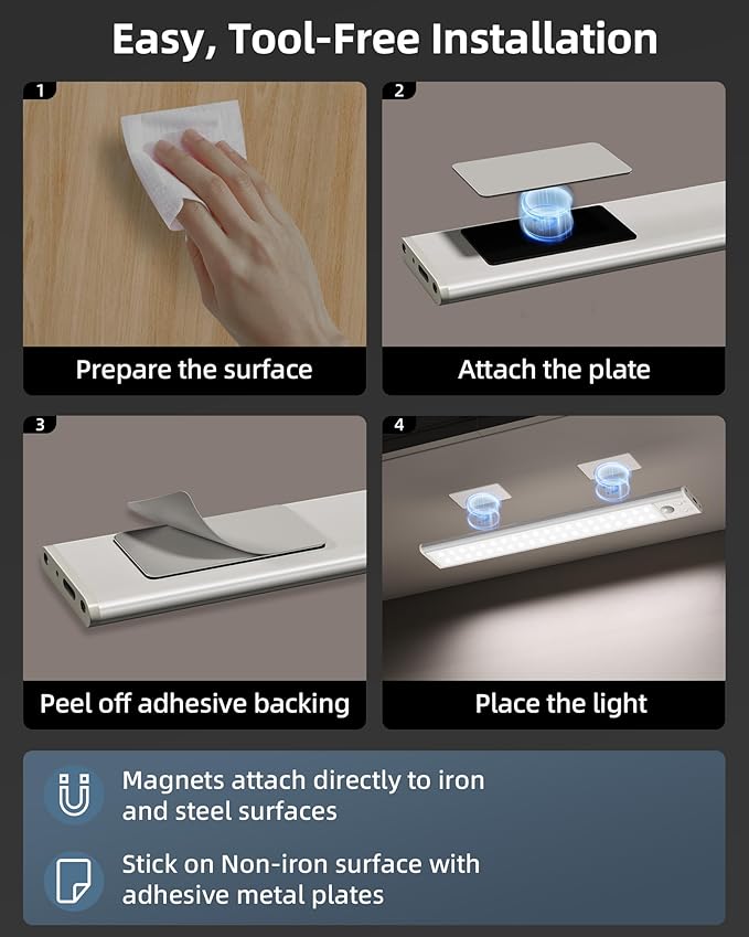 • Tool-free, Punch-free, Easy installation: Our motion sensor lights with the built-in magnet, simply attach the light to any metal surface like your kitchen cabinet, fridge, or shelving unit. For non-metal surfaces, use the included sticky iron plates to mount it on closets, pantries, or hallways. No drilling, no fuss—just quick, reliable lighting wherever you need it.