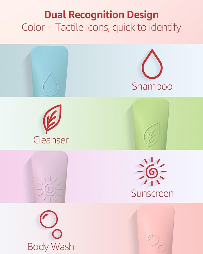 • Tactile Icons – Identify by Touch Raised icons help you quickly recognize contents like shampoo or sunscreen — even in the shower or with eyes closed.