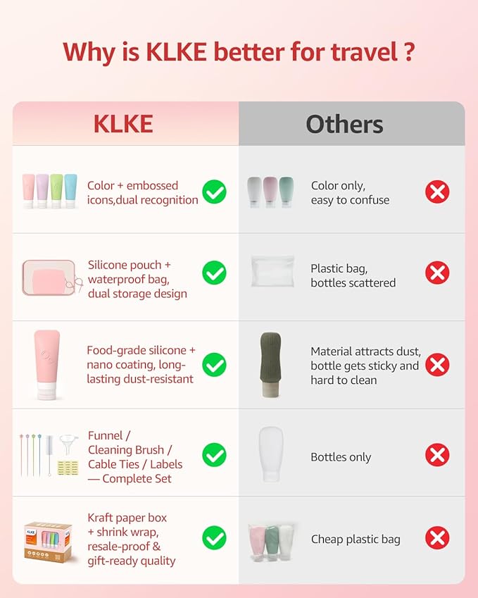 • Leakproof & TSA Approved Triple-seal bottles prevent spills. Made from BPA-free, food-grade silicone and cleared for carry-on — travel light and worry-free.