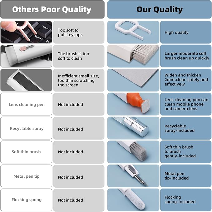 • 【MULTIFUNCTIONAL TOOLS 】Mini soft brush and soft plastic lens cleaning pen are specially designed for DSLR camera screen, lens, and other delicate surfaces. 5 more cleaning cloths of it supplied for replacement. The flocking sponge is an excellent tool for cleaning earbuds charging cases, And the earbud cleaning kit is ideal. This electronic cleaner tool is equivalent to 10 other electronic cleaning kit