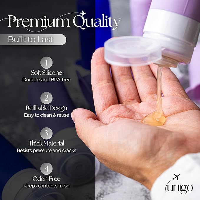 unigo Silicone Travel Bottles Set for Toiletries, Airplane Approved TSA Carry On Size, BPA Free Leakproof Refillable Squeeze Containers with Labels, Cleaning Brush and Covers (Purple)