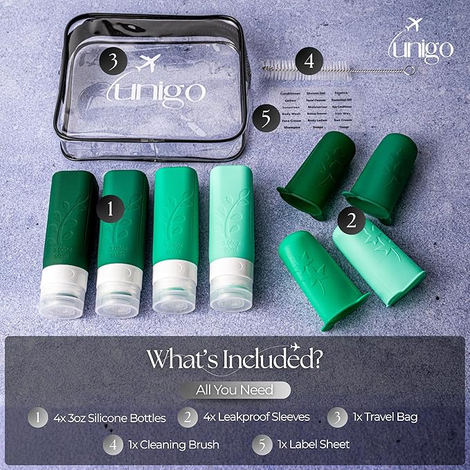 unigo Silicone Travel Bottles Set for Toiletries, Airplane Approved TSA Carry On Size, BPA Free Leakproof Refillable Squeeze Containers with Labels, Cleaning Brush and Covers (Green)