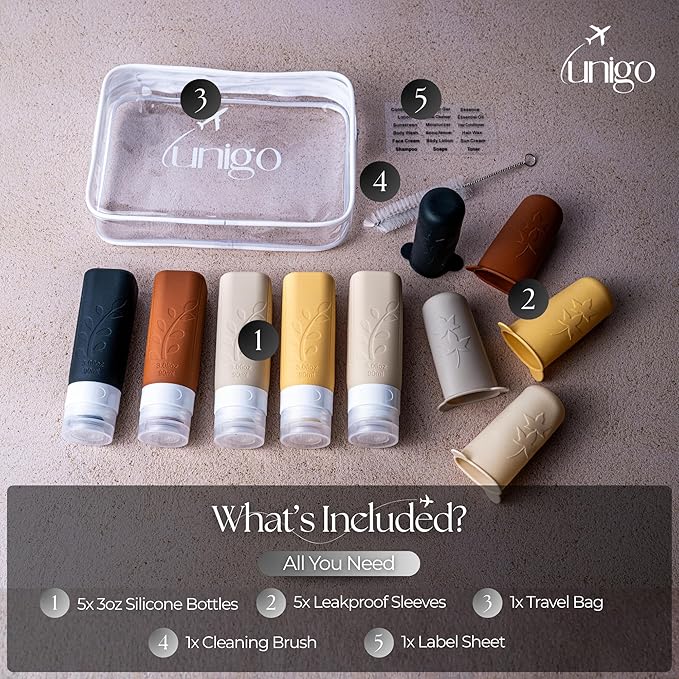 • 【Unigo Premium Travel Size Bottles】 5-Piece Leakproof Travel Bottles – Store all essential toiletries safely and prevent spills during travel or gym visits.