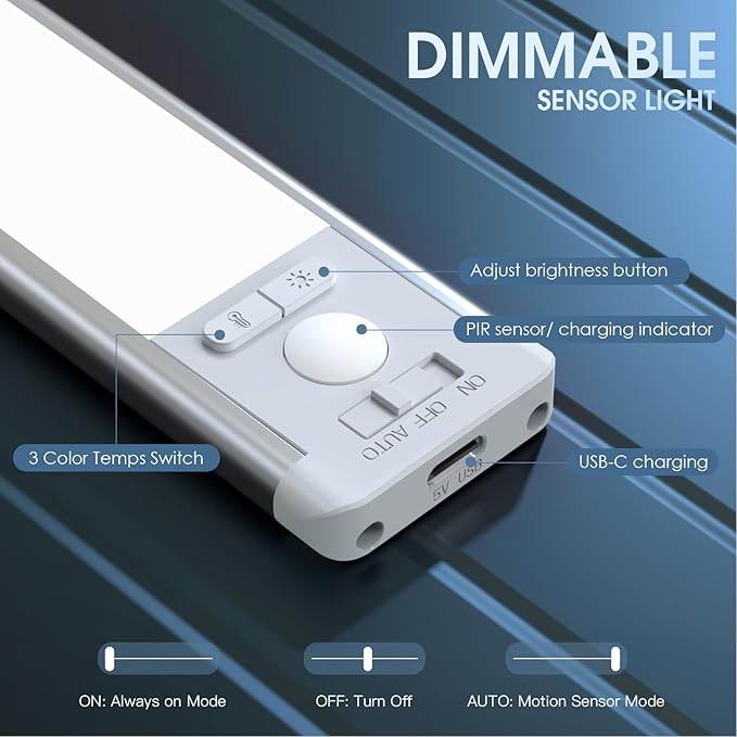 • 3 Color Temps and Dimmable Closet Lights: The cabinet lights are bright and eye-protection, thanks to 126pcs energy-saving LEDs and a non-glare frosted cover. In addition, our motion sensor light indoor has 3 color temperatures (white light, warm light, natural light) and 5 levels of brightness. So the dimmable under cabinet lighting allows you to brighten them for task like meal preparation and dim them for a motion sensor night light without waking other people up at midnight
