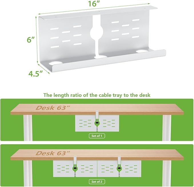 • 【Neat Workspace】This under desk cable management tray measures 16"L x 4.5"W x 6"H, offering ample space to store and conceal power strips, bulky adapters, extension cords, and USB hubs. Say goodbye to tangled wires and enjoy a clutter-free desk area.
