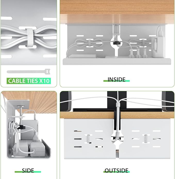 • 【Alloy Material and Components】The cable tray is crafted from alloy material.drill-free C-clips feature rubber pads at both ends to prevent scratching the tabletop, or can be secured with 3 screws. Additionally, 10 fabric cable ties are included for cable management. Neatly organize coiled cables, USB devices, and power outlets to create a comfortable and safe workspace.