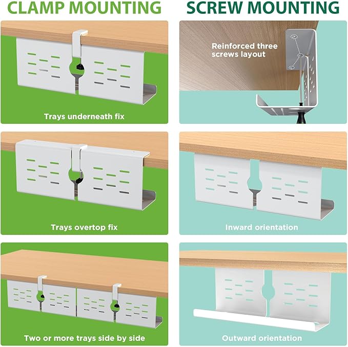 • 【Multiple installation options】The cable management tray fits flush with the desktop surface. Secure the cable tray underneath or overtop the desktop using drill-free C-clamps or a screw. Designed for versatile installation in various work settings, it's the perfect solution for cable management.