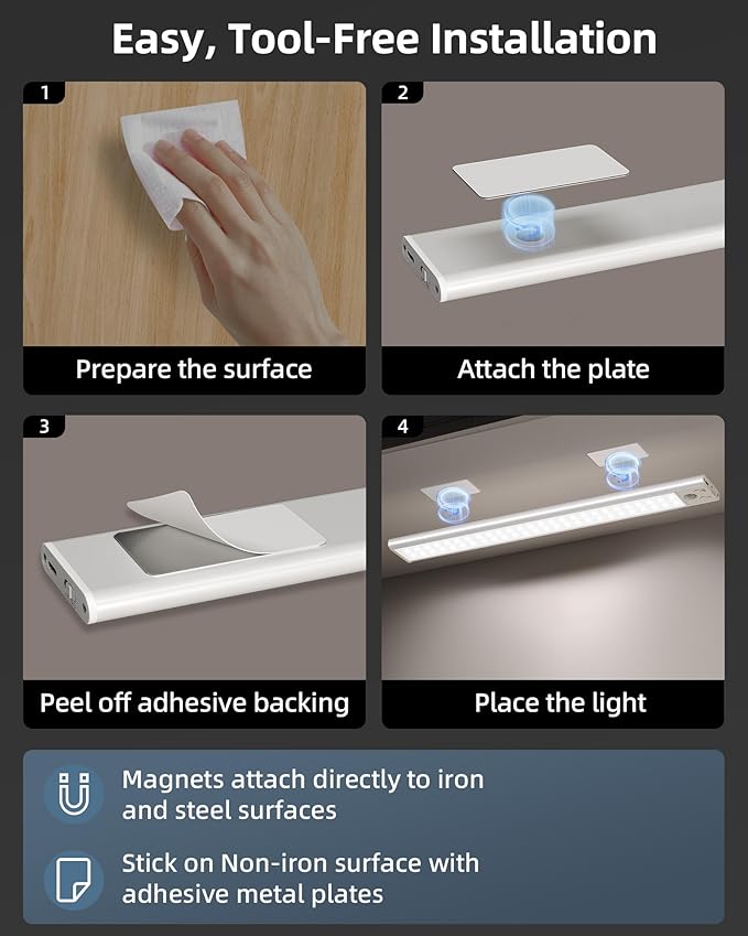 • Tool-free, Punch-free, Easy installation: Our motion sensor lights with the built-in magnet, simply attach the light to any metal surface like your kitchen cabinet, fridge, or shelving unit. For non-metal surfaces, use the included sticky iron plates to mount it on closets, pantries, or hallways. No drilling, no fuss—just quick, reliable lighting wherever you need it.