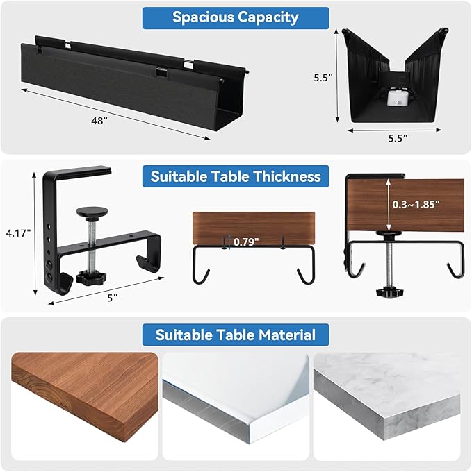 • [Hide and Organize Cables Effectively] Engineered for both generous storage and rugged reliability, this spacious cable management tray (48"L x 5.5"W x 5.5"H) easily accommodates even the bulkiest adapters and power strips—keeping every cord neatly organized and completely hidden under your desk for a clean, clutter-free workspace that lasts.